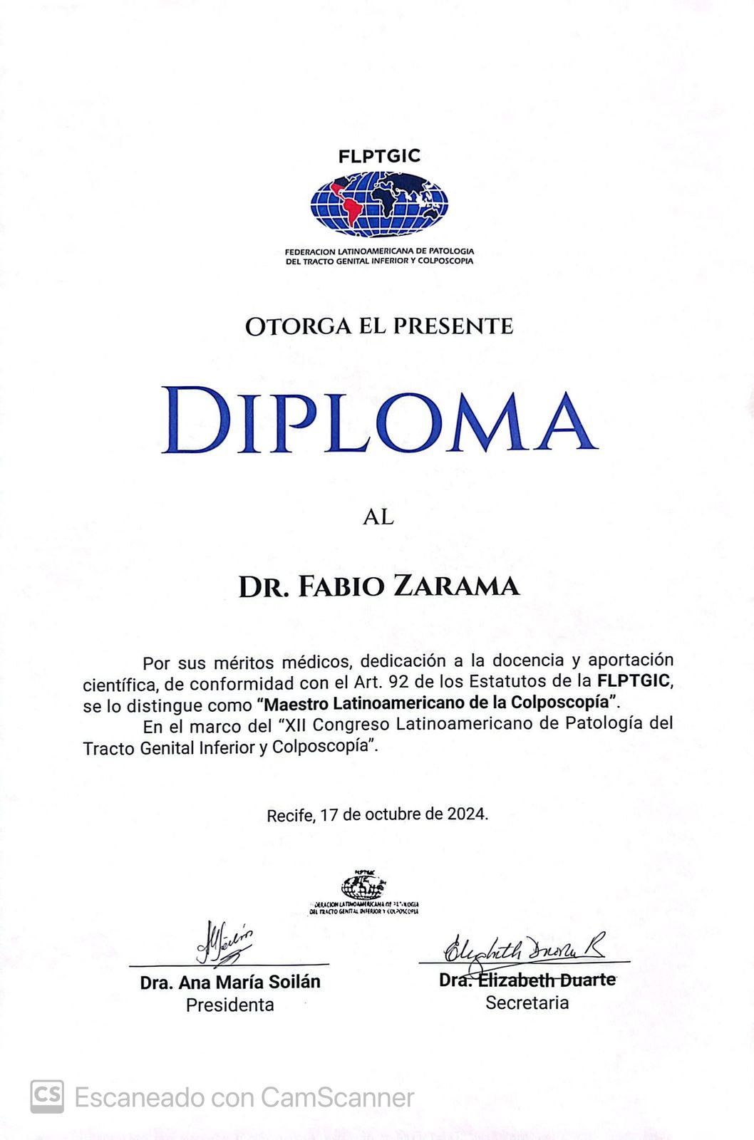 Este reconocimiento resalta sus méritos, su dedicación a la docencia y sus valiosas contribuciones científicas, conforme al Art. 92 de los Estatutos de la FLPTGIC, que lo distingue como “Maestro Latinoamericano de la Colposcopia” durante el XII Congreso Latinoamericano de Patología del Tracto Inferior y Colposcopia.